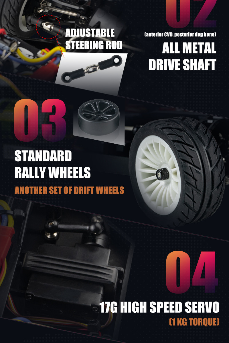 8. Rally wheels are provided as standard, and another set (4 pieces) of drift wheels can be replaced.