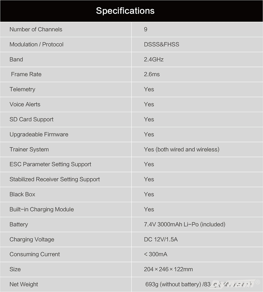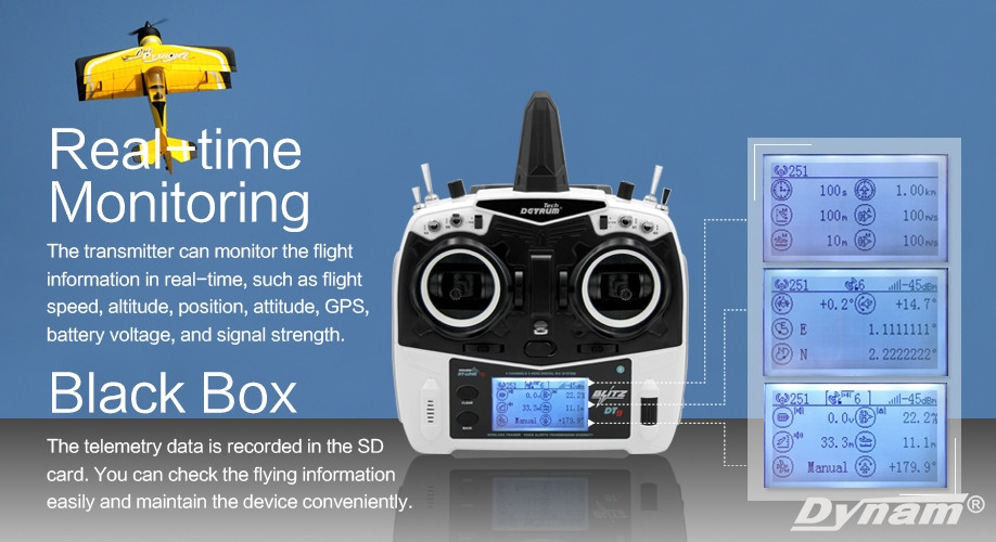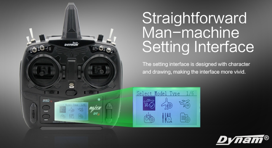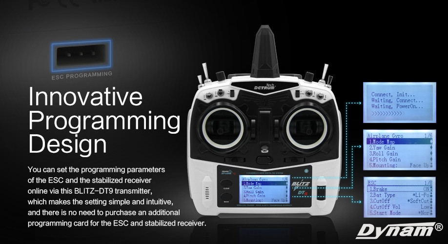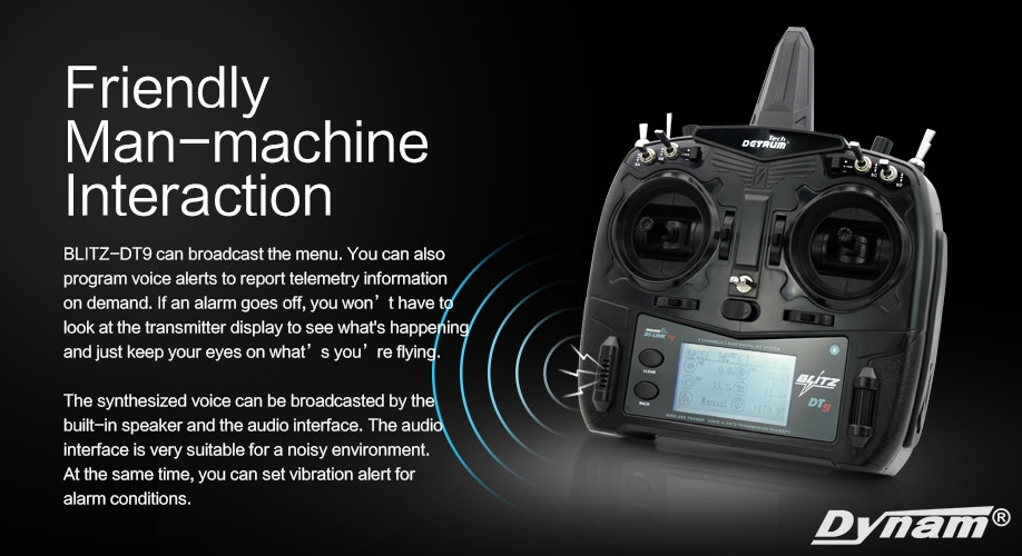 Simple and Powerful, Detrum Blitz DT9 is a 2.4GHz 9-channel smart transmitter with telemetry and programing capabilities. With one transmitter, you can take the full control of your flying from all aspects, whether it is ESC settings, gyro receiver programming, BNP with various types of receivers or wireless training.with full telemetry function,the blitz Dt9 can receive temperature , altitude,GPS,voltage,current and telemetry data ,to keep you motre connected to your flying than ever before ,The blitz DT9 also works with all detrum stablizter receiver and back the telemetry data