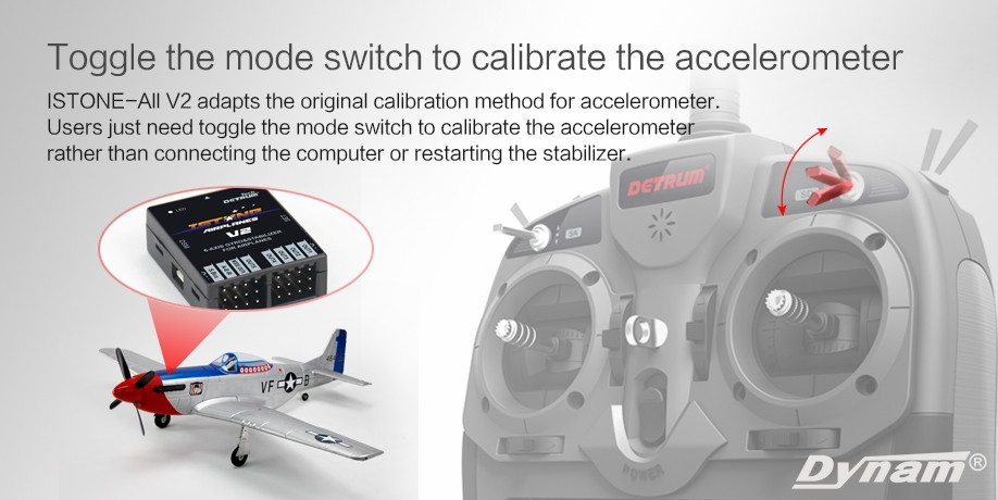 - Toggle the mode switch on transmitter quickly to calibrate the accelerometer. It is a simpler way to operate than connecting computer and restoring the stabilizer.