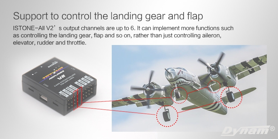 For connecting with the DSM receiver, ISTONE-All V2 adds two output channels based on the previous version. It can implement more functions such as controlling the landing gear, flap and so on, rather than just controlling aileron, elevator, rudder and throttle.
