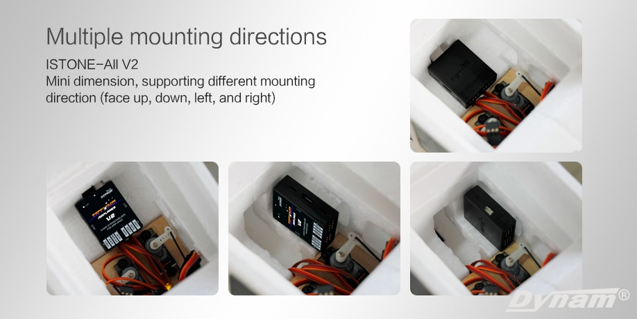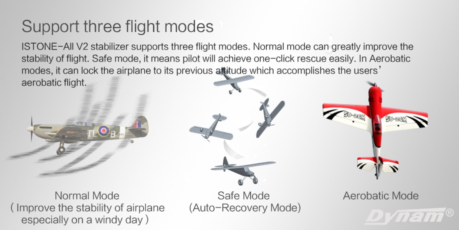 ISTONE-All V2 is the 6-axis gyro & stabilizer that special for airplane including normal wing, delta wing and V-tail airplane. It is used to connect with the receiver to control the flight; ISTONE-All V2 stabilizer supports three flight modes. Normal mode can greatly improve the stability of flight. Safe mode, it means pilot will achieve one-click rescue easily. In Aerobatic modes, it can lock the airplane to its previous attitude which accomplishes the users’ aerobatic flight.