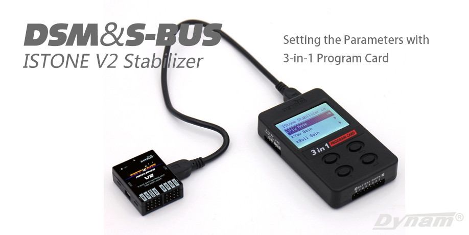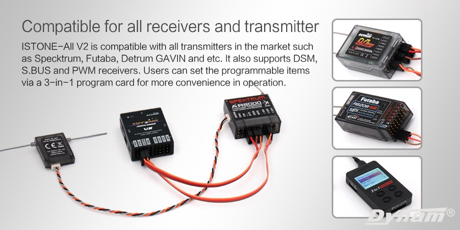 ISTONE-All V2 is compatible with all transmitters in the market such as Specktrum, Futaba, Detrum GAVIN and etc. It also supports DSM, S.BUS and PWM receivers. Users can set the programmable items via a 3-in-1 program card for more convenience in operation.