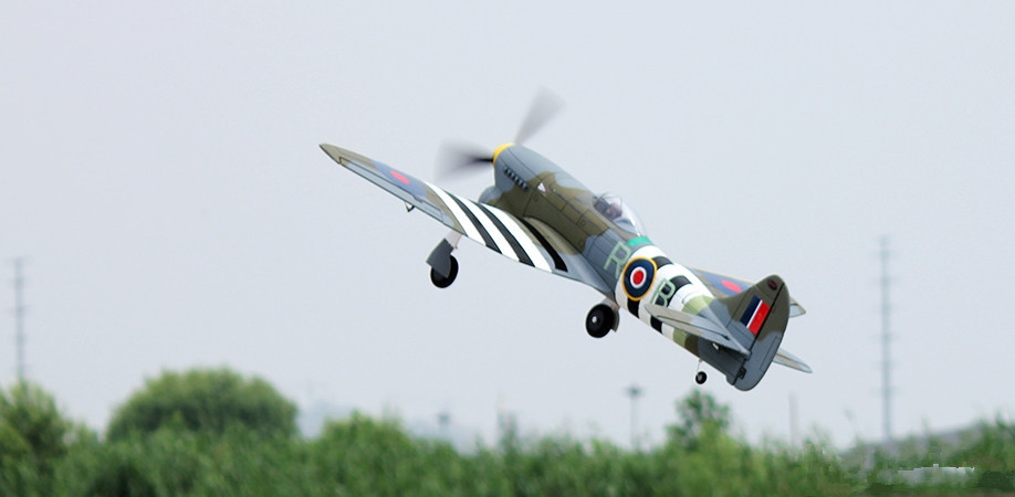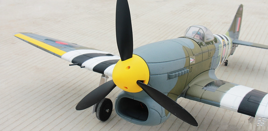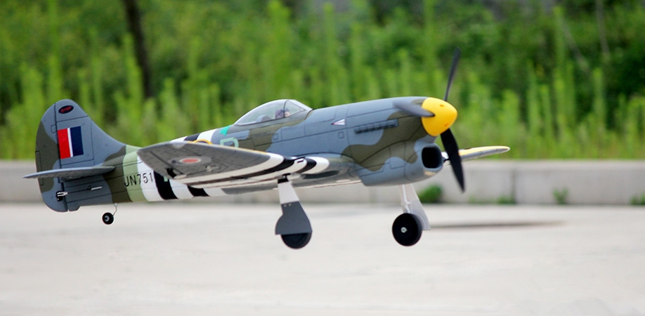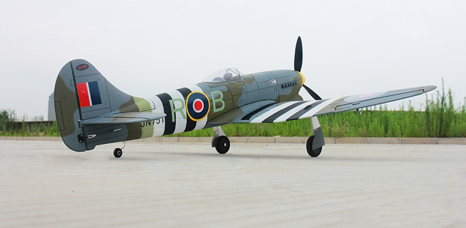 The Dynam Hawker Tempest warbird is beautifully presented and is powered by 14.8V 2200 li-poly battery coupled with a high powered 500KV Brushless Motor. This new Warbird by Dynam is a 5-6 channel R/C aircraft with stunning looks make this super realistic in the air or taxiing on the ground. Months of flight testing and design yield an aircraft that is super stable and capable of maintaining flight at super slow speeds that allow novice to master flight mechanics with ease. This aircraft includes electronic retracts.